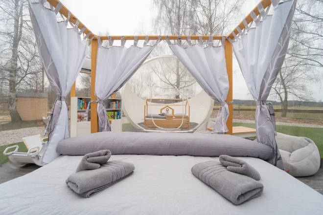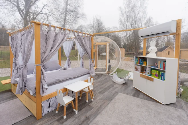 Bublina je priehľadná, aby ste počas celého pobytu mali výhľad do všetkých strán. Vo vnútri nájdete manželskú posteľ s nebesami, relaxačný vak so stolíkom, domčekovú rozkladaciu posteľ pre 2 osoby, skriňu plnú spoločenských hier a hračiek, prebaľovací pult, vykurovanie aj chladenie pomocou klimatizácie, Montessori hojdačku 5v1, detský stolík so stoličkami a vláčikodráhu.