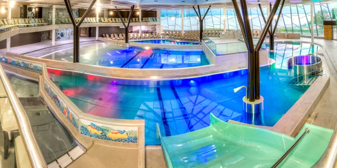 - Vodný svet: 4 vnútorné bazény – relaxačný, masážny, vlnový a detský bazén, 4 exteriérové bazény – dva termálne bazény, masážny a oddychový bazén (v bazénoch sú rôzne vodné atrakcie, vzduchové a masážne trysky)