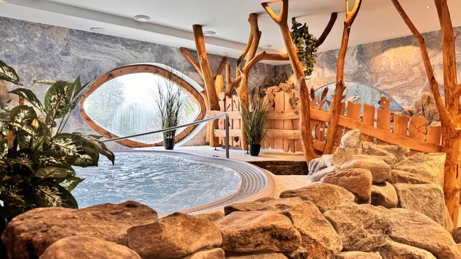 - Vyhrievaný kúpeľový bazén, 2 vírivky pre 6 a pre 10 osôb, oddychová miestnosť