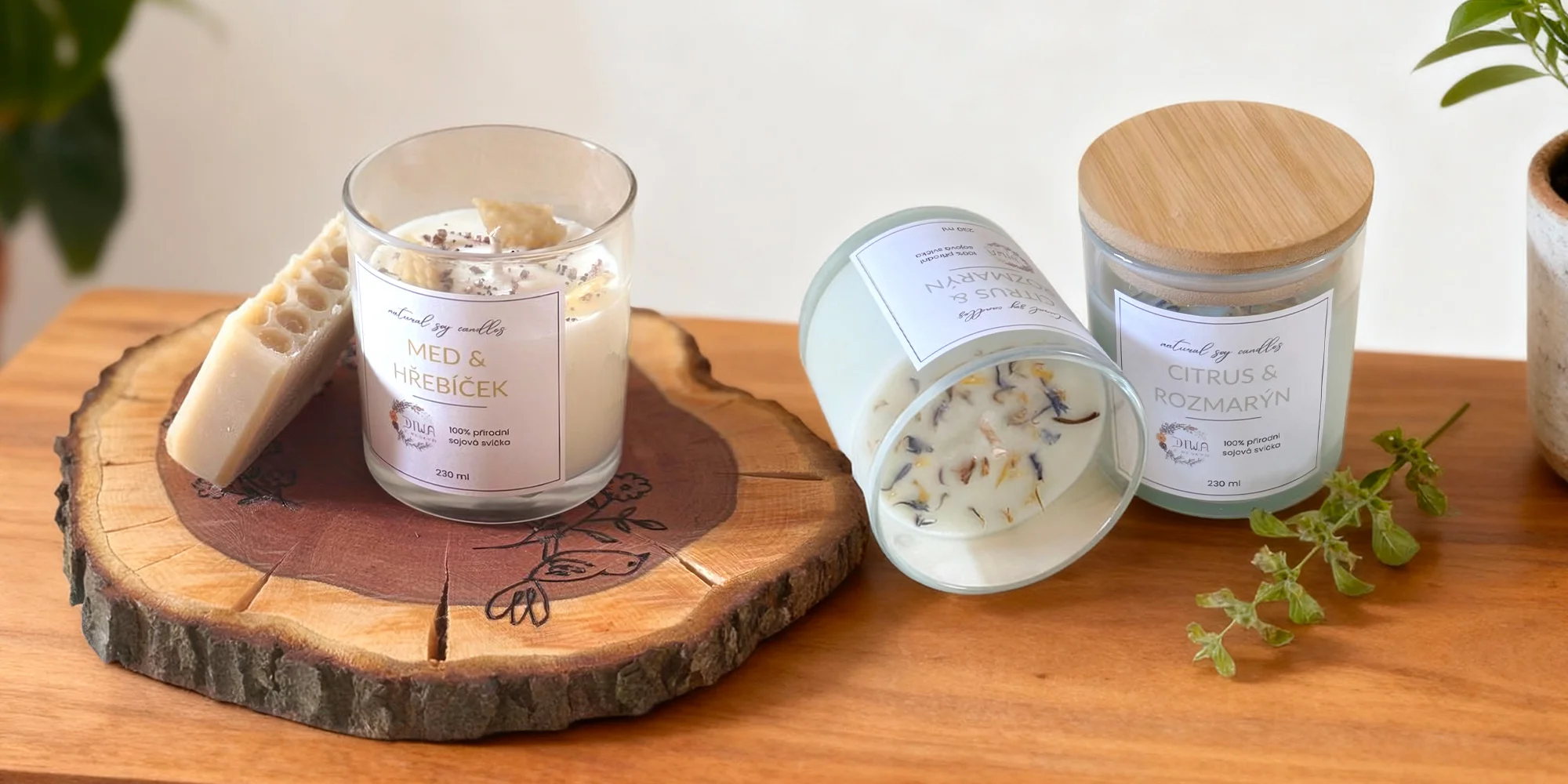 Ručne odlievané sviečky zo 100 % prírodného sójového vosku si môžete dopriať v niekoľkých vôňach – od citrusu s rozmarínom až po vanilku, levanduľu či med s klinčekmi. Sviečky horia pomaly a bez toxických splodín, takže sú šetrné nielen k vašim dýchacím cestám, ale aj k prírode.