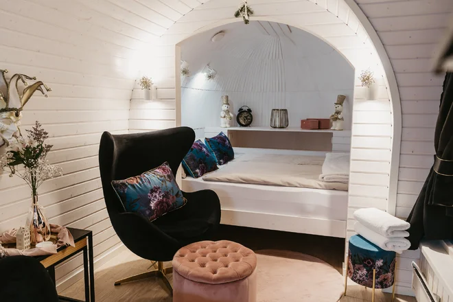 Užívať si tu budete relax v severskom štýle a maximálny komfort – v iglú je veľká manželská posteľ s výhľadom do záhrady, vybavená kuchynkakávovarom a samozrejme kúpeľňa so sprchou, kde budete mať pripravené aj uteráky, toaletné potreby a na vyžiadanie fén.
