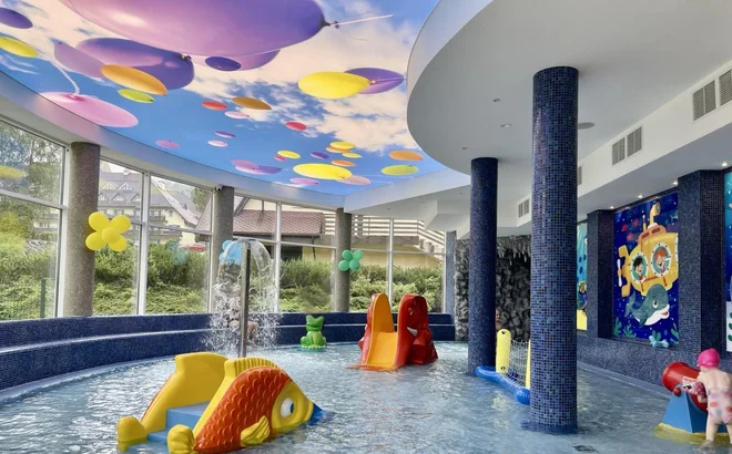 - Vodná zóna pre deti – bazén s 3 šmykľavkami, jaskyňa s vodopádom, vodné delo a ďalšie atrakcie
