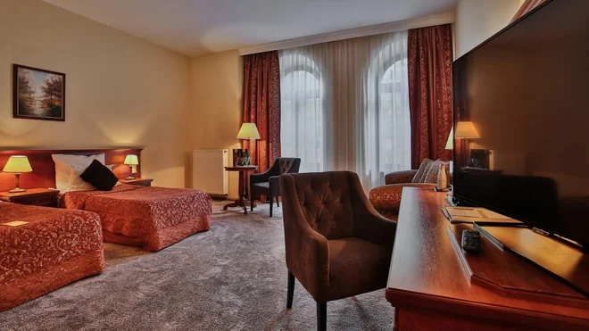 V štyroch krídlach hotela sú rozmiestnené krásne zariadené izby s manželskými posteľami, ktoré sa dajú spojiť a rozdeliť podľa potreby. Vy sa zabývate v dvojlôžkovej izbe Standard alebo dvojlôžkovej izbe Premium s možnosťou dvoch prísteliek. Vo všetkých môžete rátať s kúpeľnou vybavenou sprchovým kútom, uterákmi, fénom a sadou kozmetiky, ale aj s TV, trezorom, minibarom a rýchlovarnou kanvicou. Väčšina izieb má tiež balkón s výhľadom na Tatry.